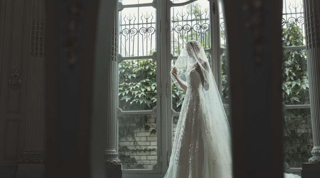 Worn here with a silk tulle, two-tier, full-length veil with a bespoke design; covered with hand-appliqued Lily Of The Valley petals cascading to the floor.