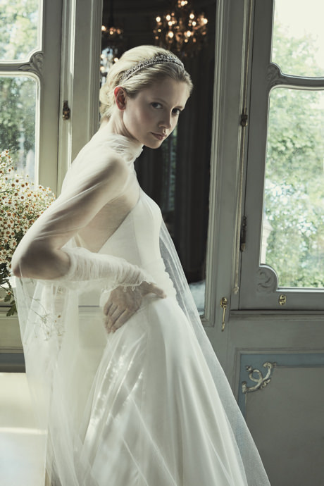 Worn here with separate tulle gathered sleeves with a ‘button and loop’ fastening at the cuff.