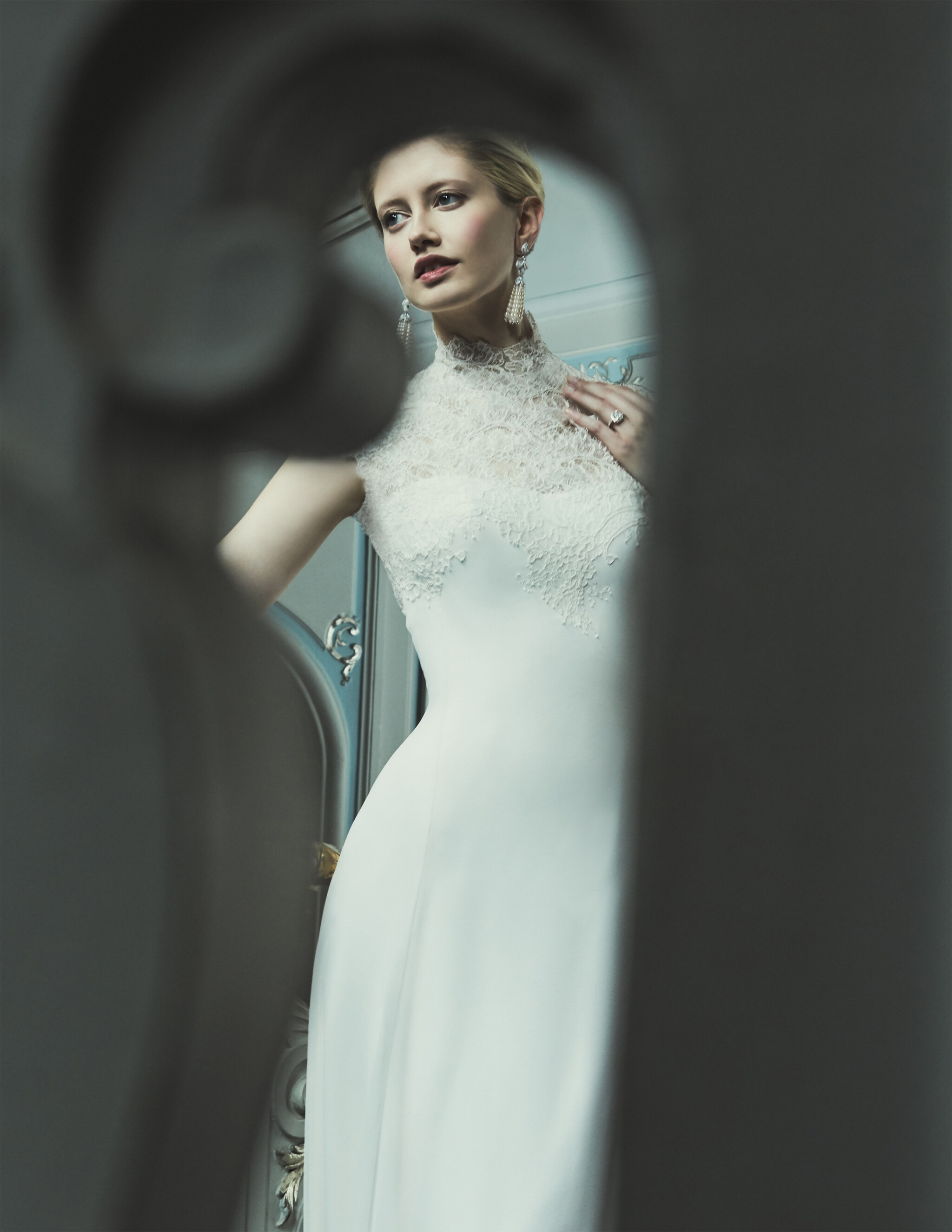Romantic and ethereal in essence, the Gina Georgette Buttercup wedding dress has a gently fitted silhouette and corset; so signature of Phillipa Lepley| Phillipa Lepley. The beauty of this dress is owed to the perfect balance of the soft, floating silk georgette and the drama in the high collar lace neckline and sharp cap sleeve.
