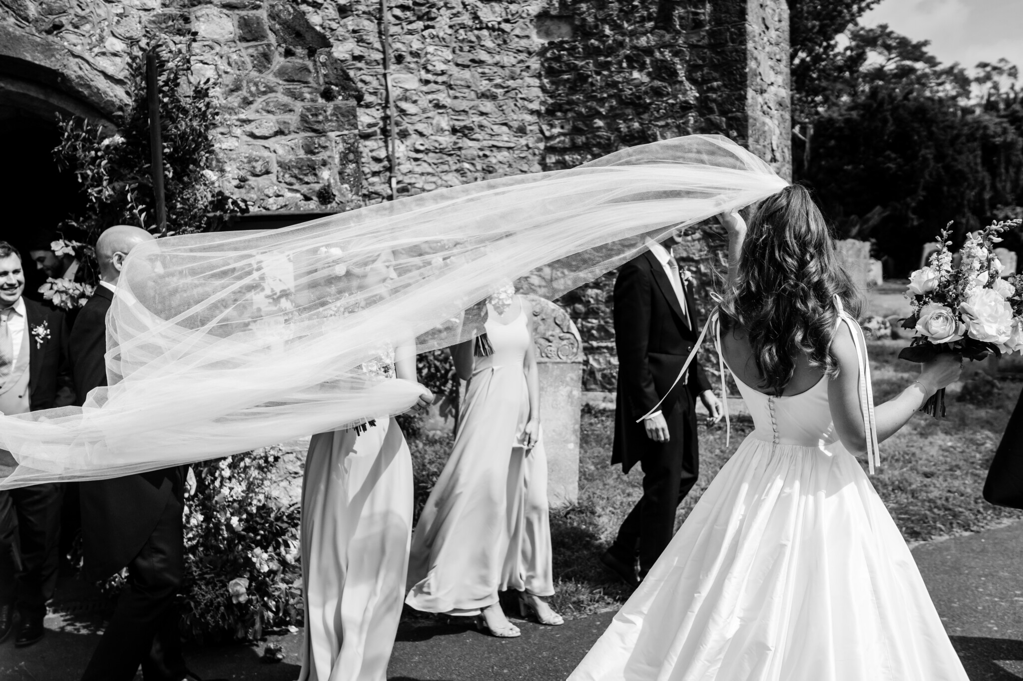 Phillipa and Anna share a love of bows, featured perfectly in her bespoke wedding dress. Bows were hand tied at the shoulders with long ties to create life and movement, and Anna’s white silk tulle veil even featured an additional bow, created especially for Anna to wear into the evening.