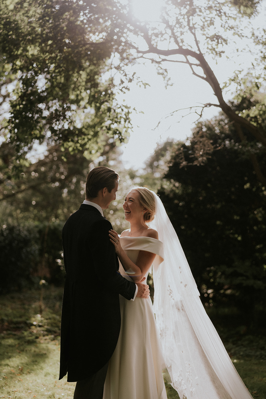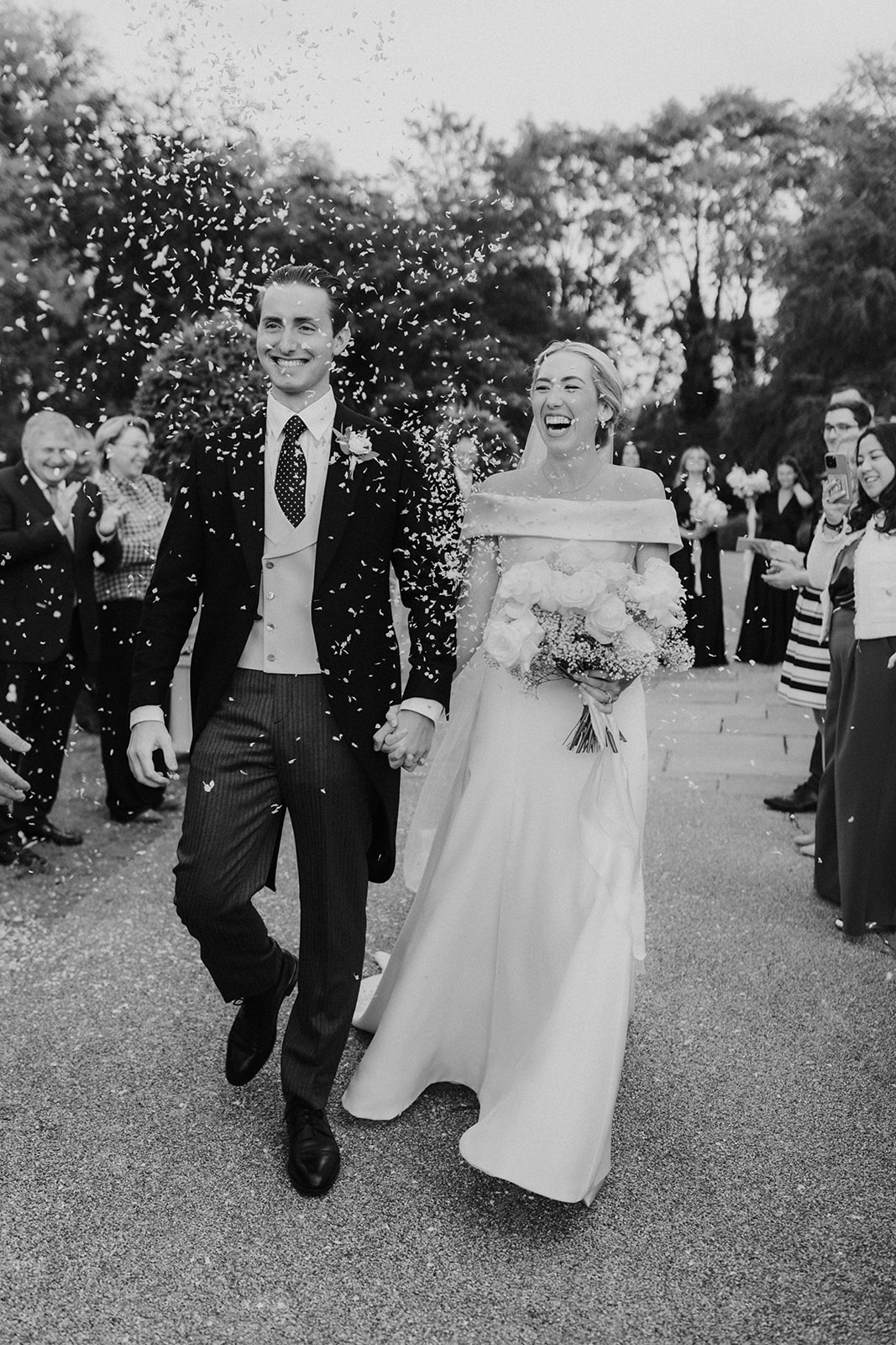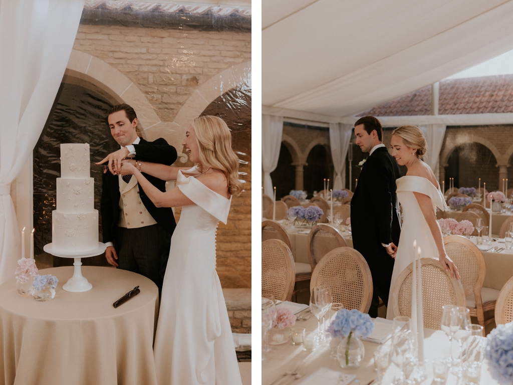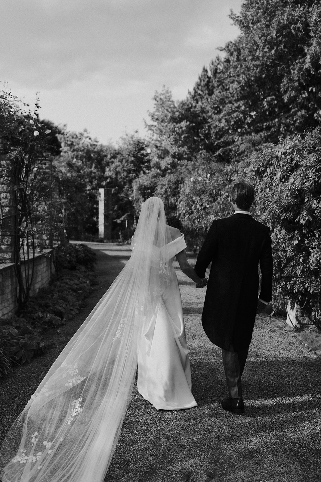 Pollyanna paired her minimalist wedding dress with a delicate hand-embroidered two-tier silk tulle ‘Lily of the Valley’ veil. Inspired by flora and fauna, Phillipa often incorporates the beauty of the natural world into her fine hand-embroidery. A Phillipa Lepley classic – Lily of the Valley – petals were scattered organically across luxury French silk tulle and hand-embroidered on to create Pollyanna’s veil.