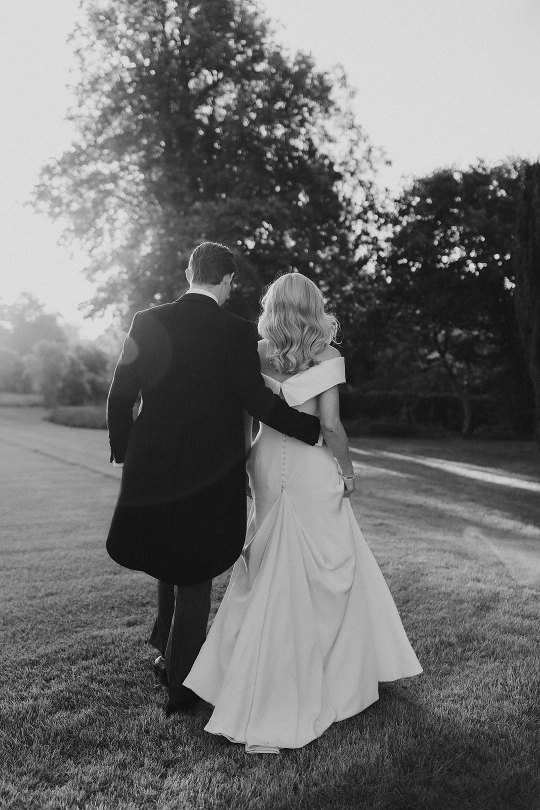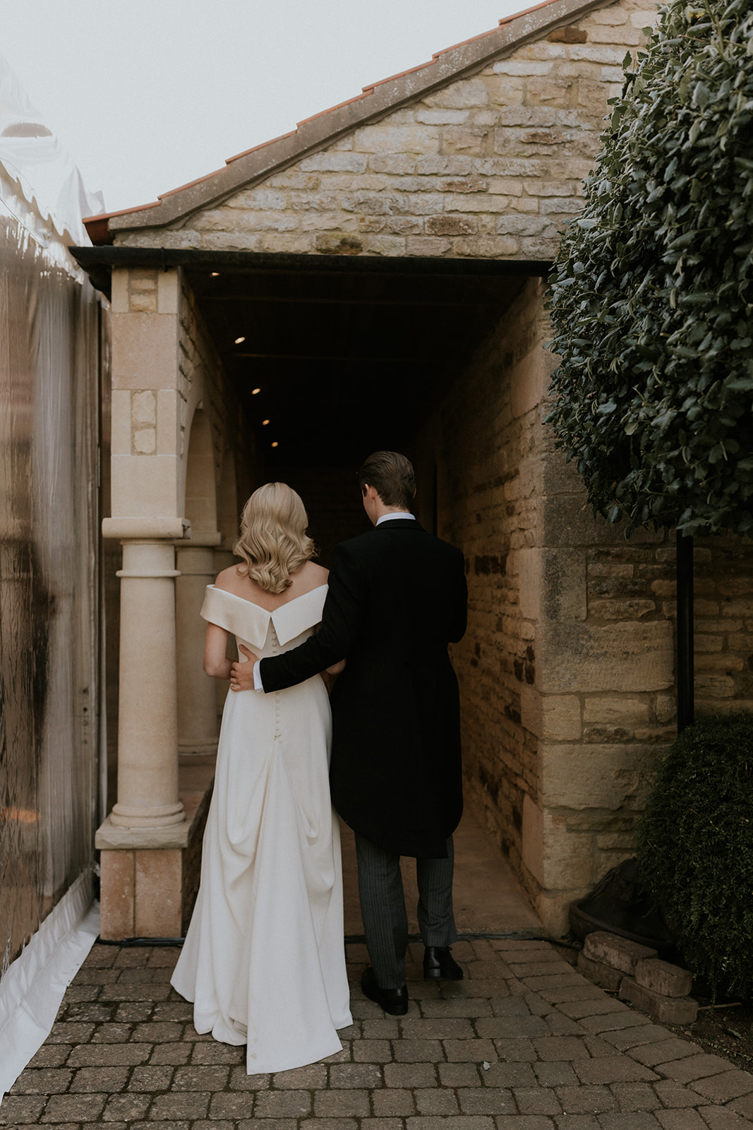 The collar demurely wrapped around Pollyanna’s shoulders, finishing in a statement, angular back neckline. Hand-sewn buttons and loops lined the centre back of the dress, leading to a long bridal train. For the evening, the Atelier team installed a bustle into the skirt to loop up the train when dancing.