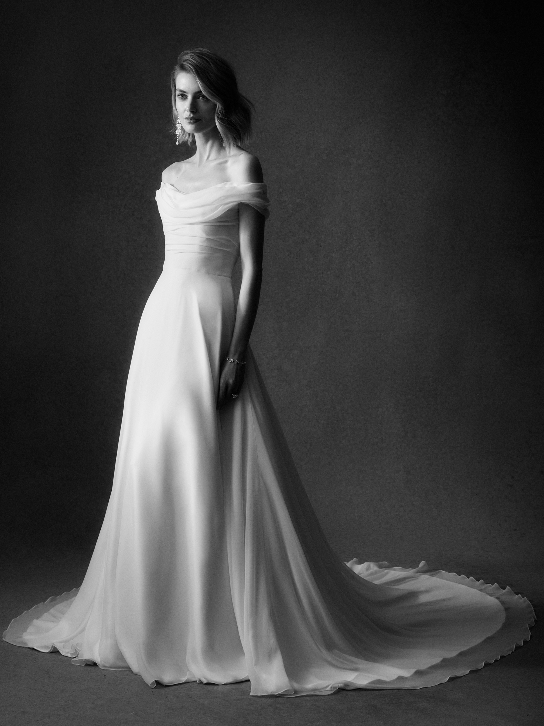 A minimalist beauty, ‘Élégance’ is a lightweight, off-the-shoulder gown crafted from luxurious silk georgette.