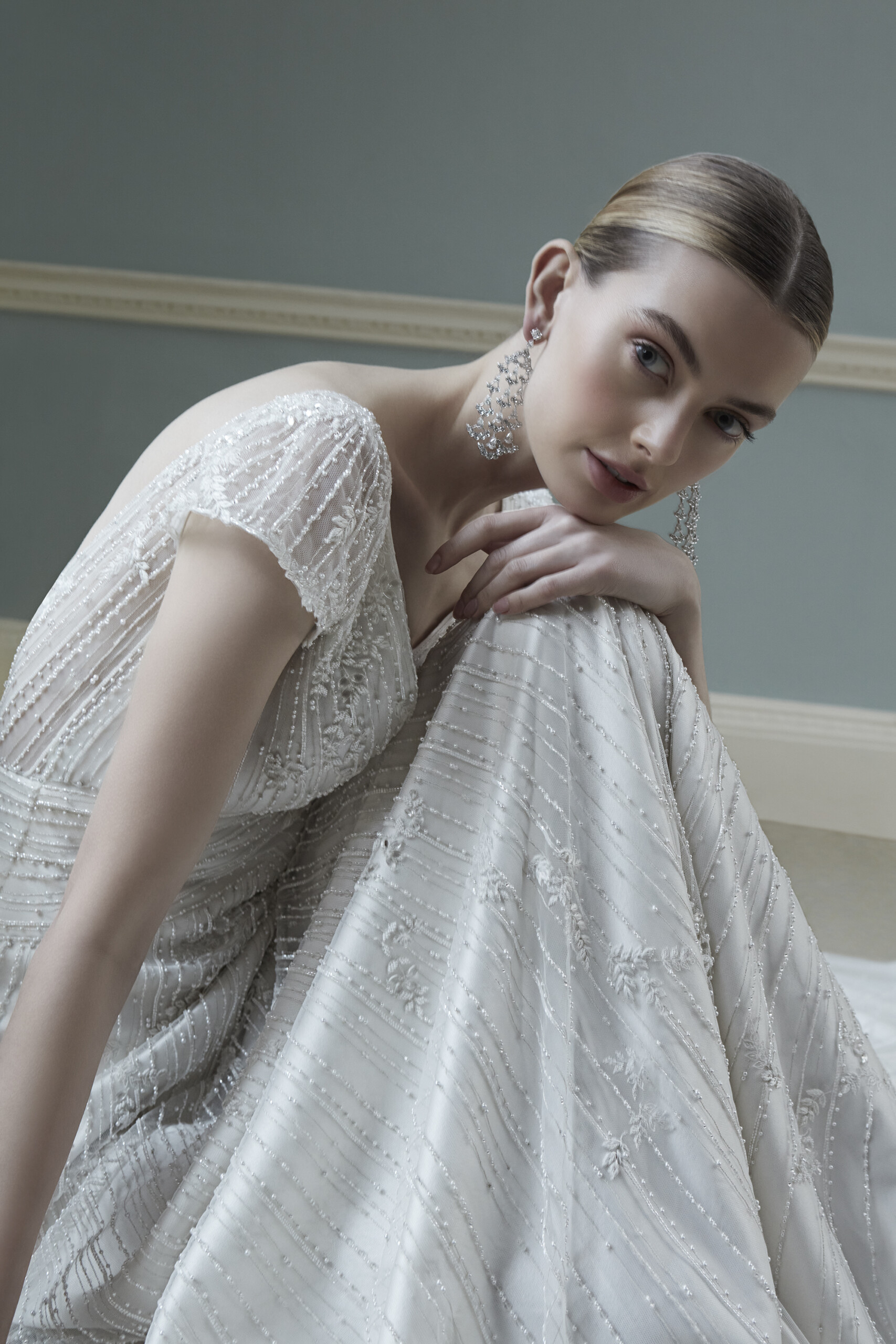 Arabesque also features hand-crafted corsets that are lighter than ever, beautifully slim belts, luxurious peau de soie fabric (a soft, satin-weave silk) and shoes and bags that can be adapted to match any dress. Several of Arabesque’s dresses combine beading and embroidery to remarkable effect; this kind of thread-work is unique to Phillipa Lepley and requires considerable time and expertise to achieve.