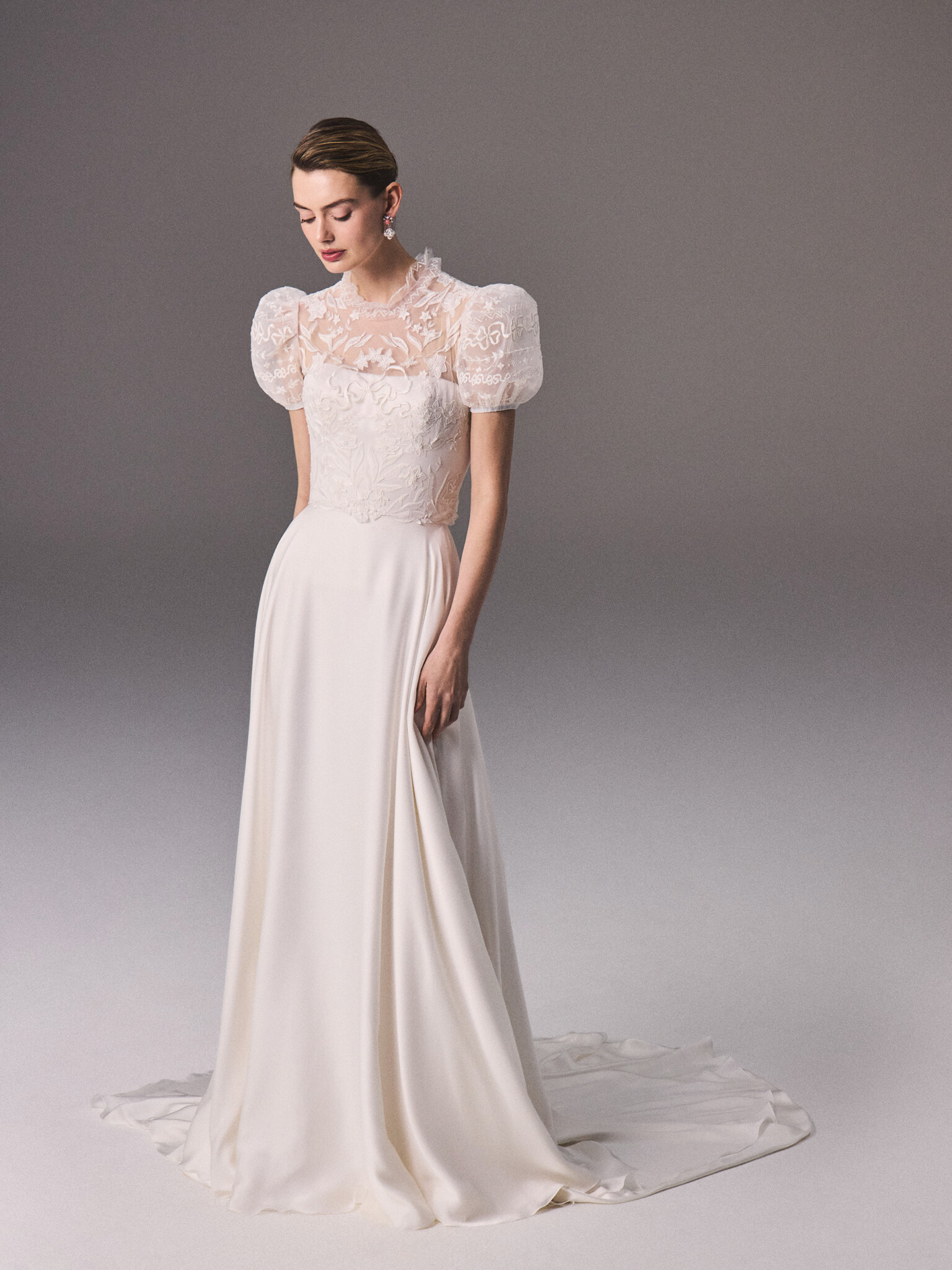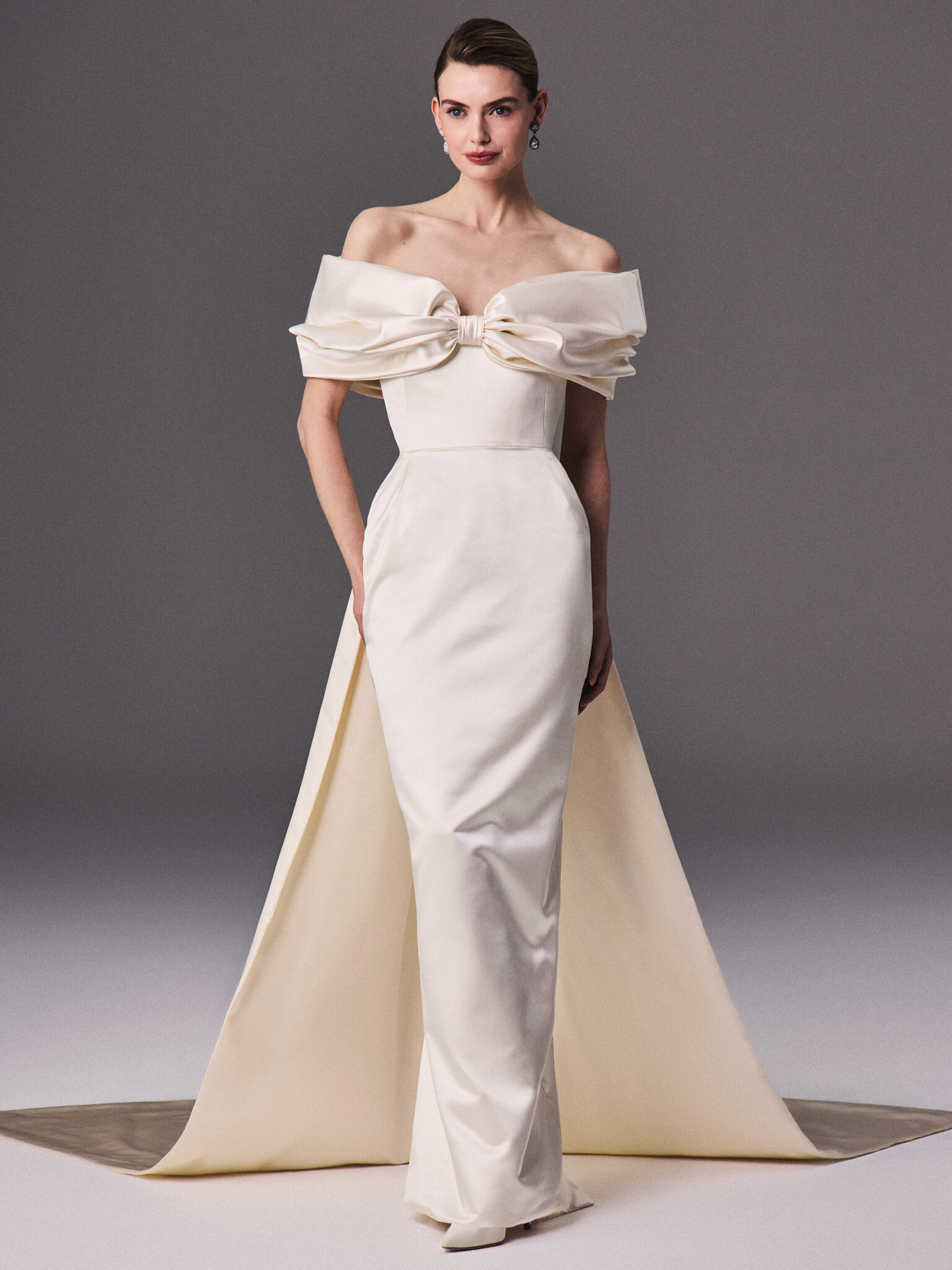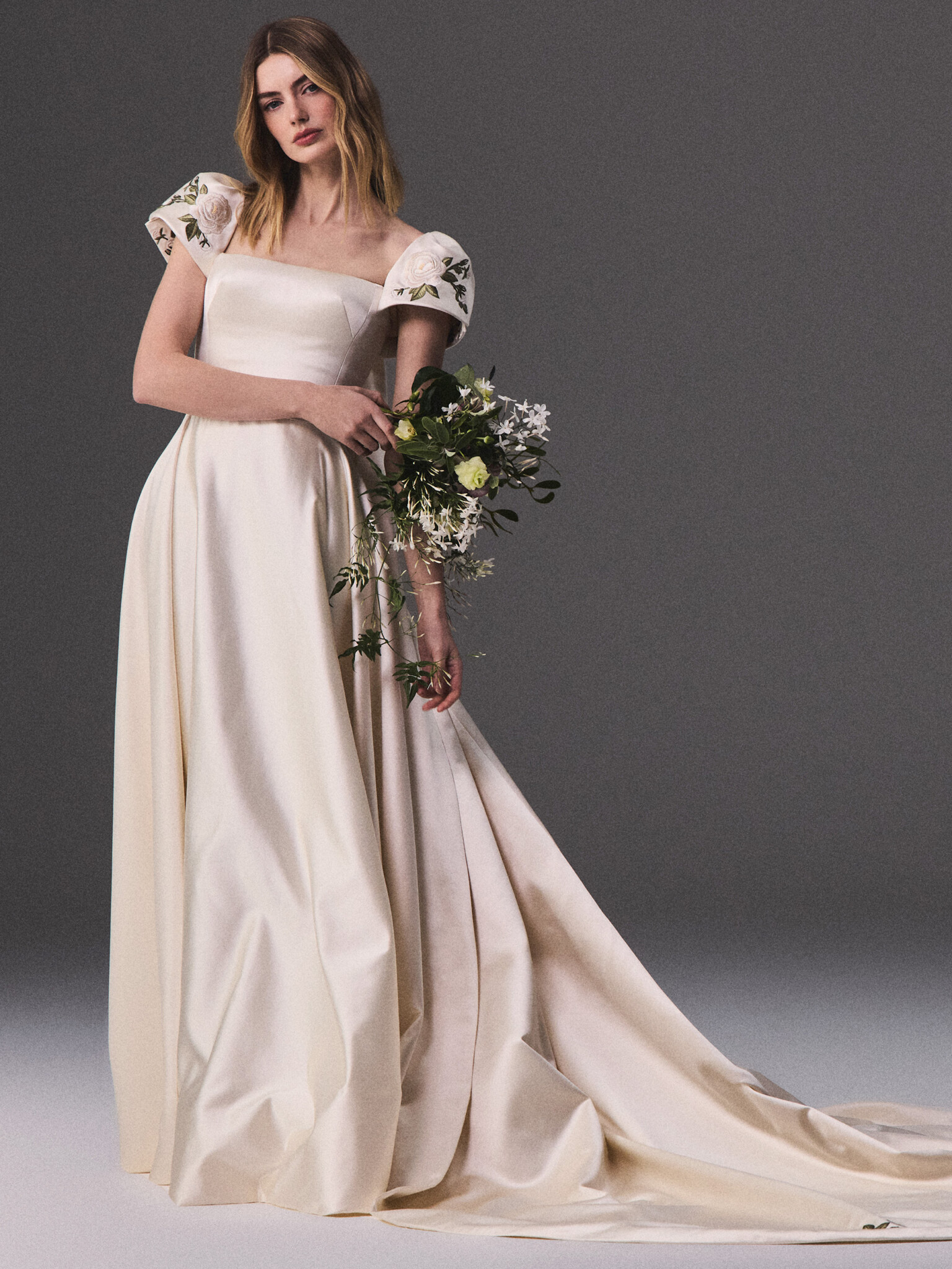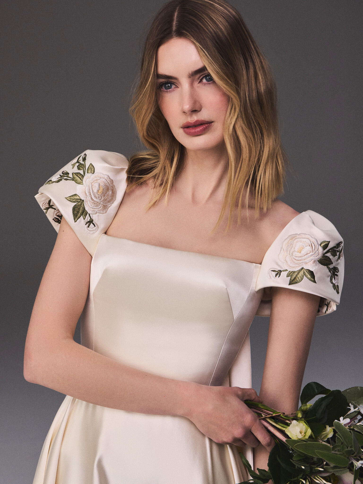 A focal point of this collection are the show-stopping shoulder and sleeve details; Phillipa has delighted in incorporating organza sails, shoulder bows, knotted elements and sleeves as varied as umbrella, puff ball, cap and fluted. Hidden structural magic ensures these elements stay perfectly in place and seemingly simple gowns, when paired with contrasting lace or embroidered sleeves, create a strong, modern statement.