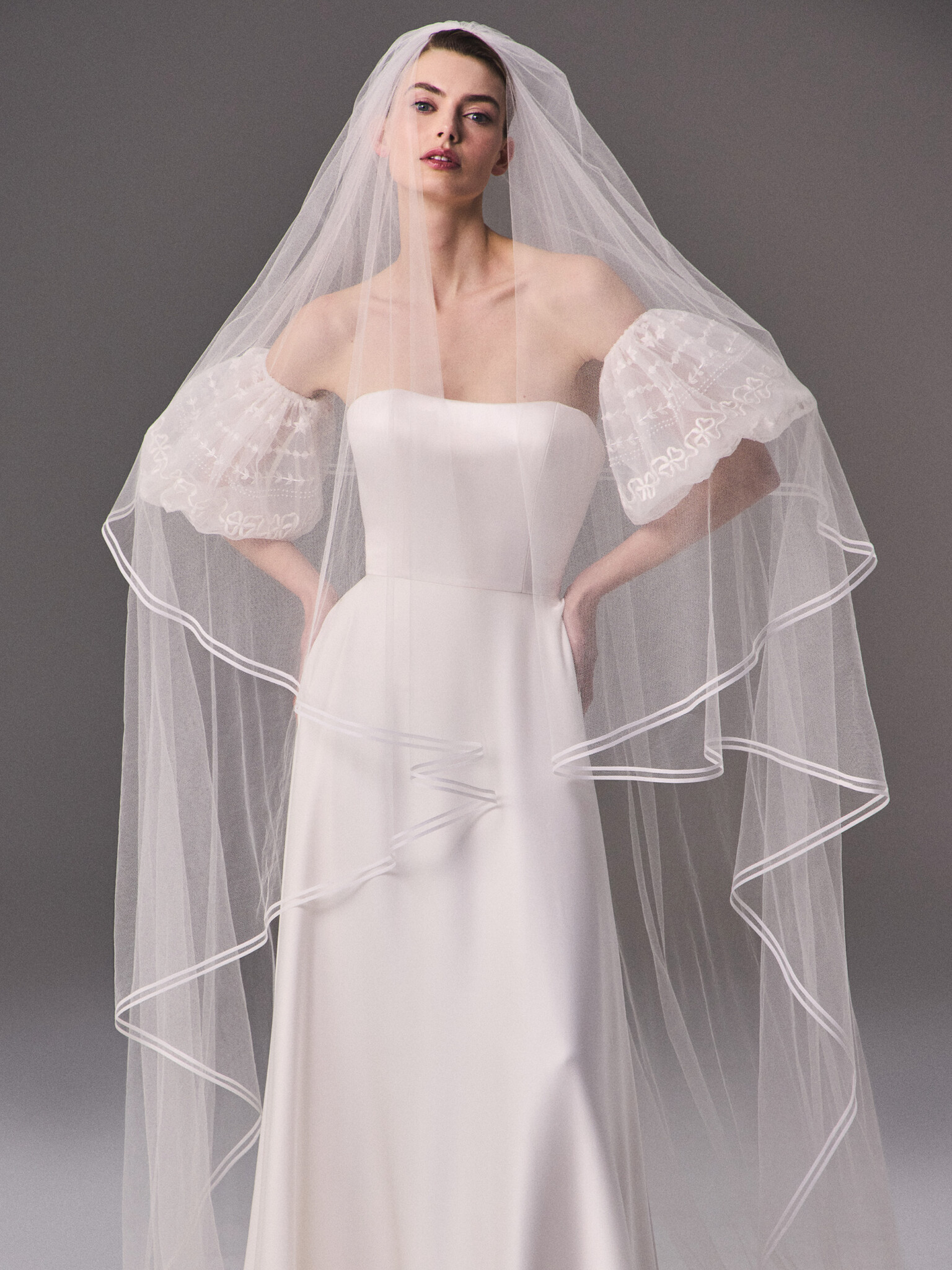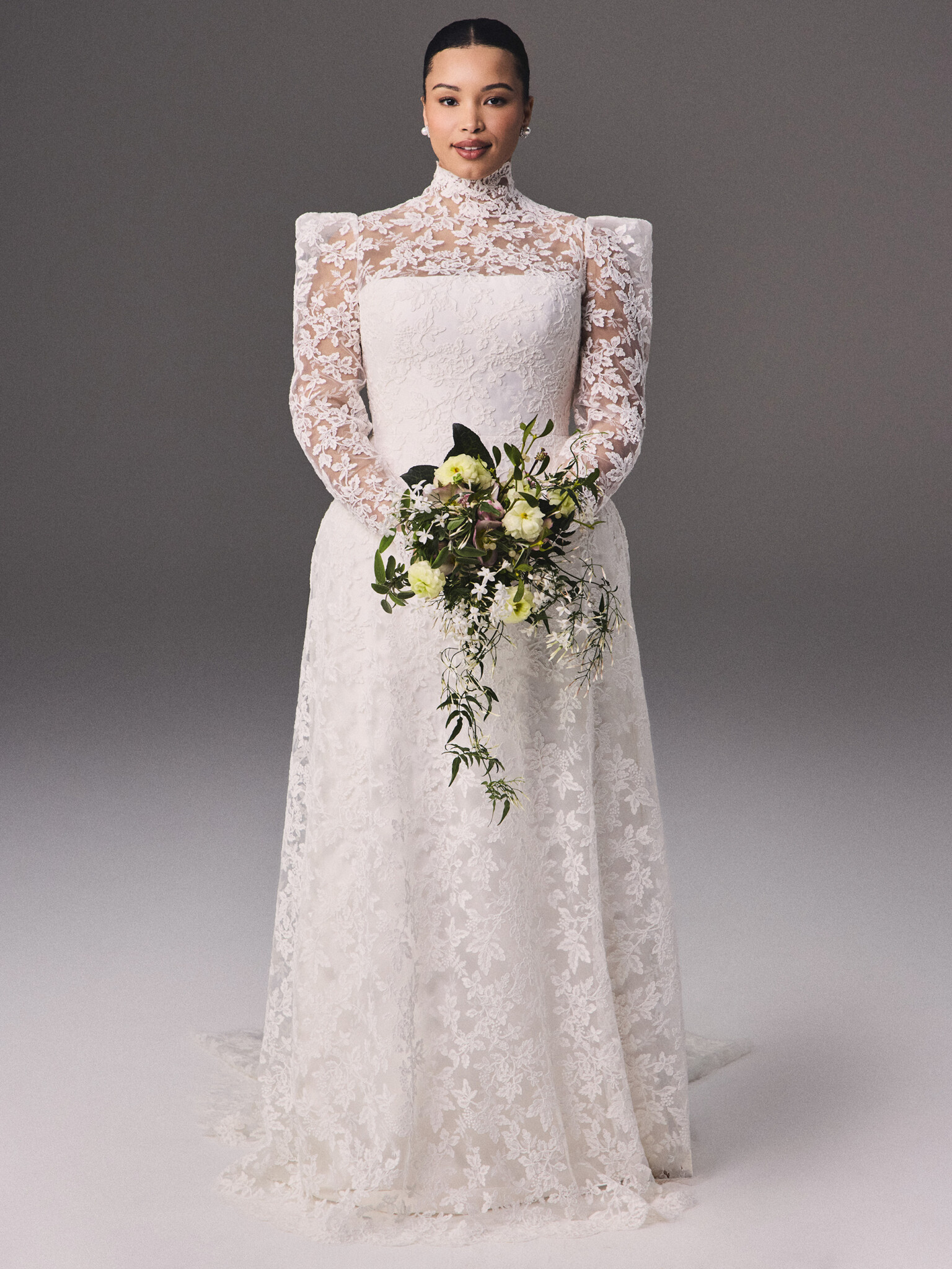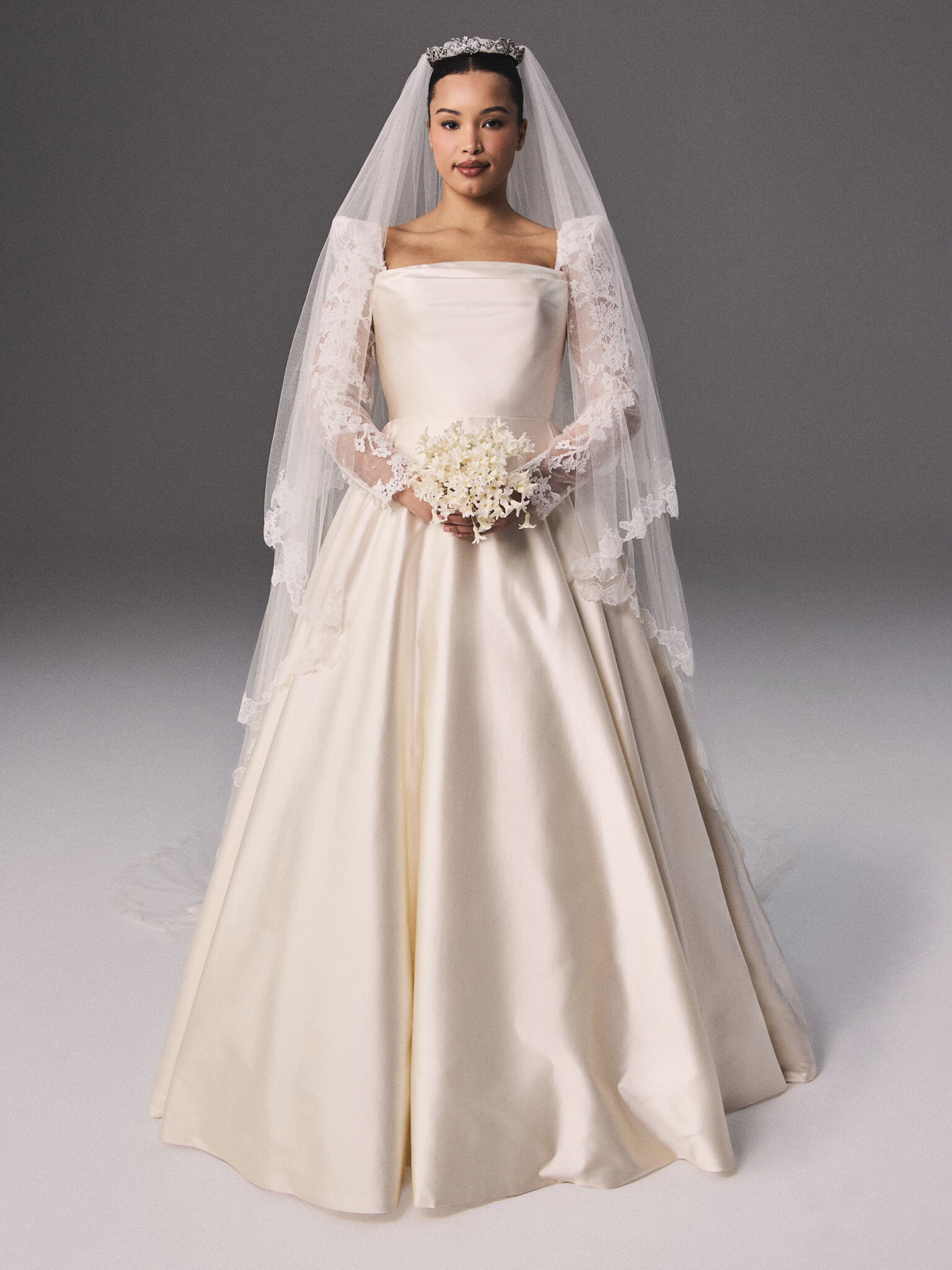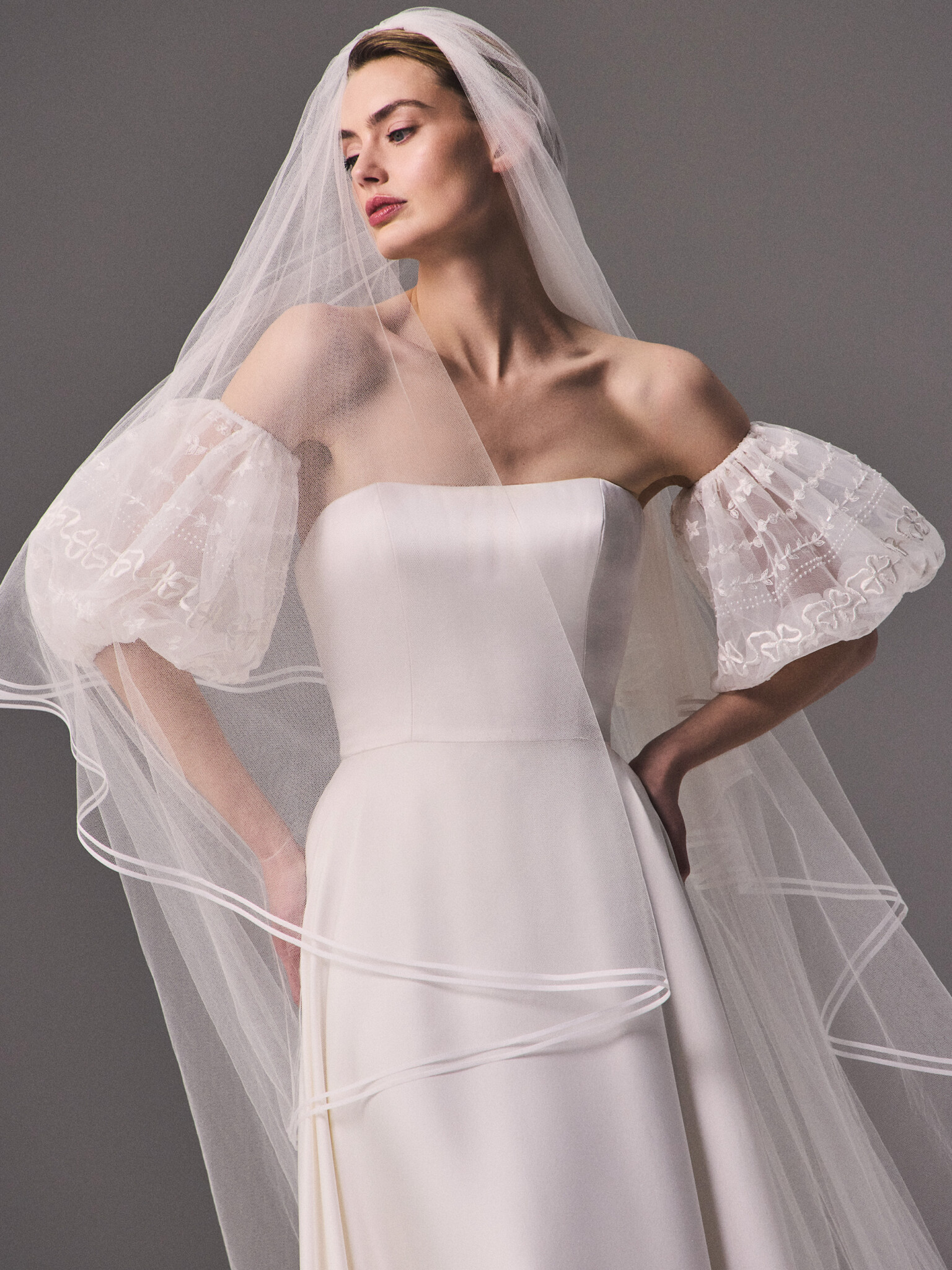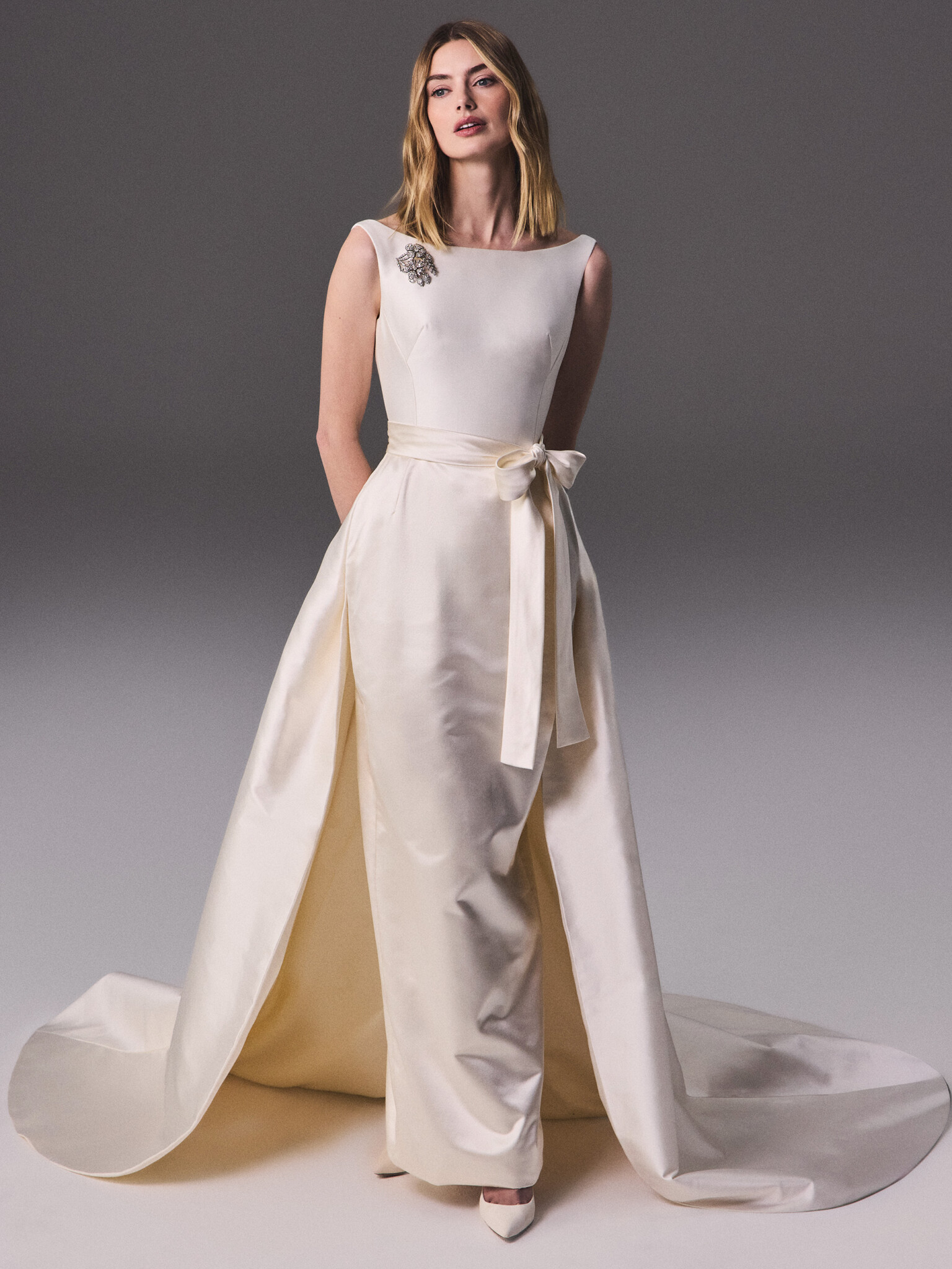 A focal point of this collection are the show-stopping shoulder and sleeve details; Phillipa has delighted in incorporating organza sails, shoulder bows, knotted elements and sleeves as varied as umbrella, puff ball, cap and fluted. Hidden structural magic ensures these elements stay perfectly in place and seemingly simple gowns, when paired with contrasting lace or embroidered sleeves, create a strong, modern statement.
