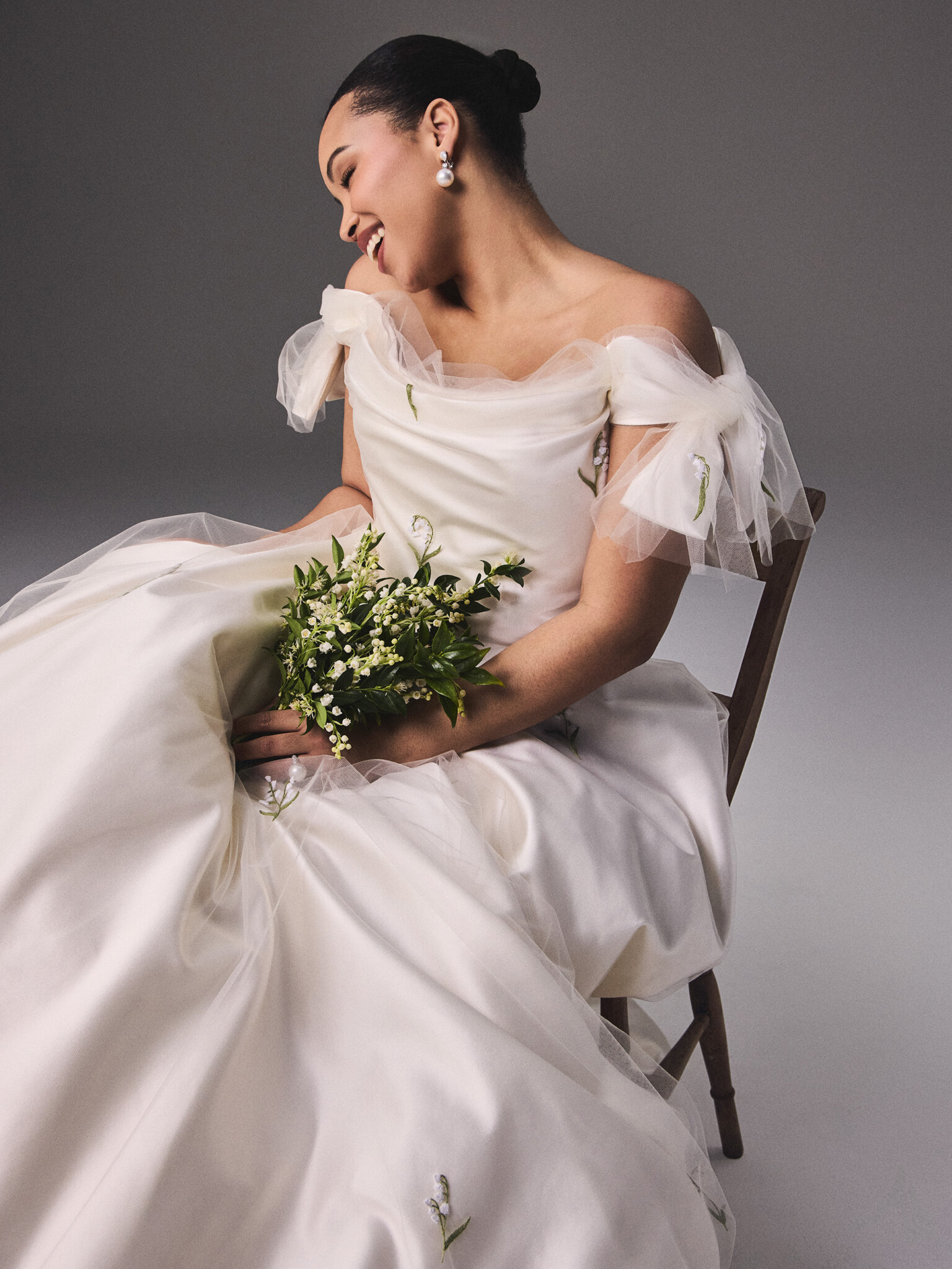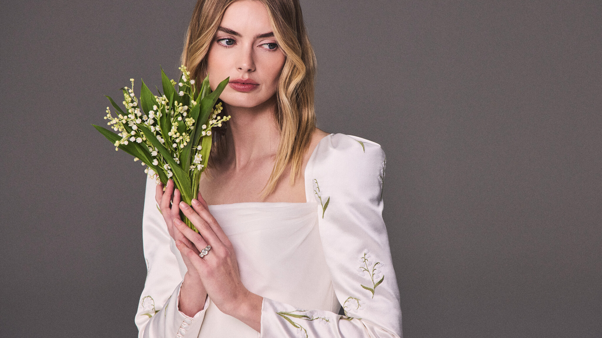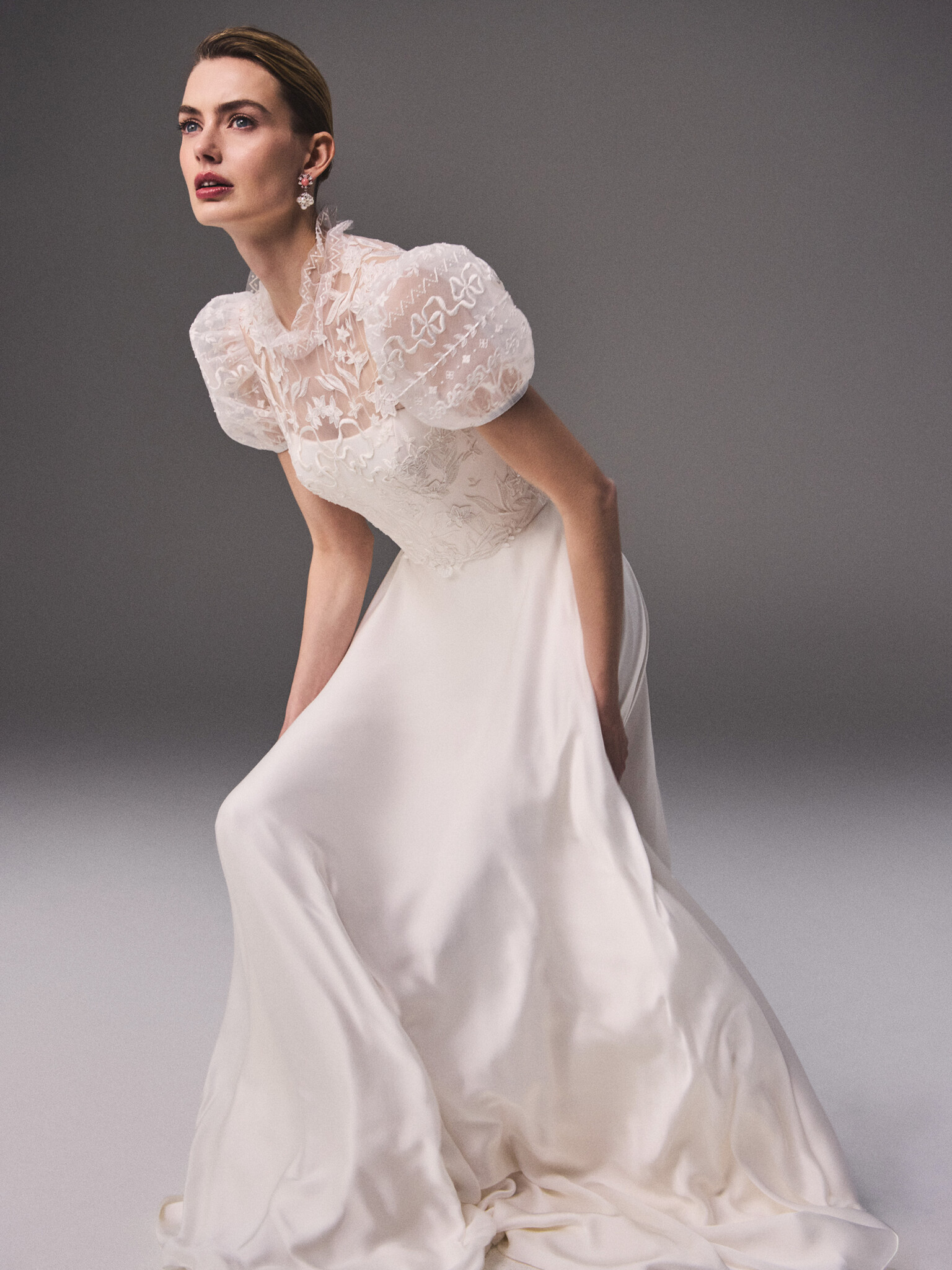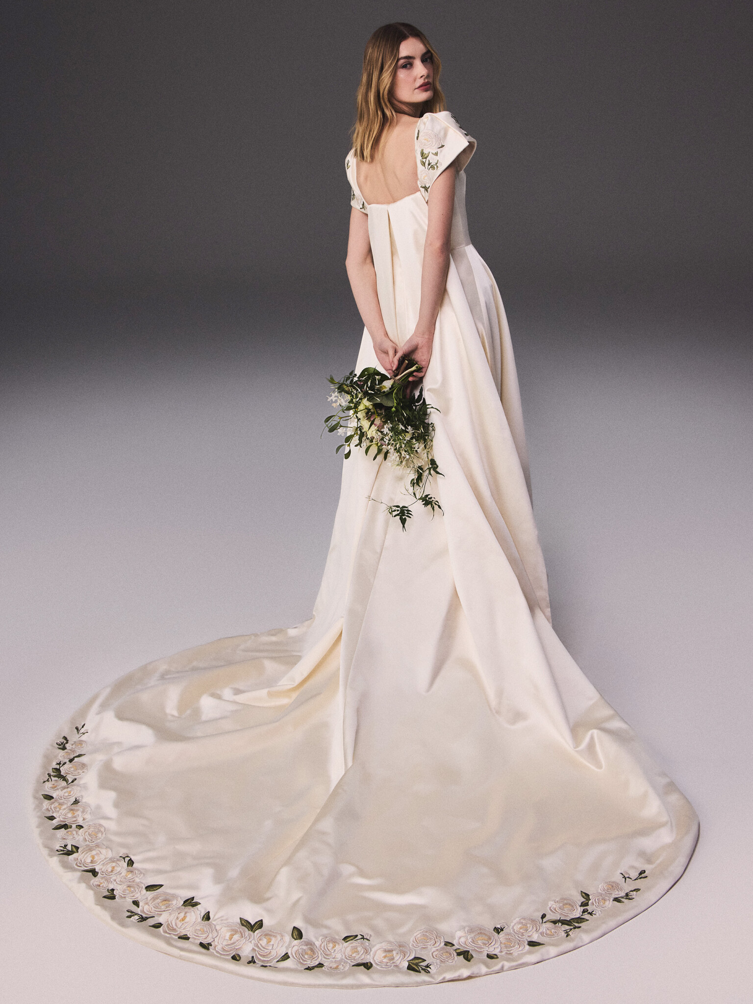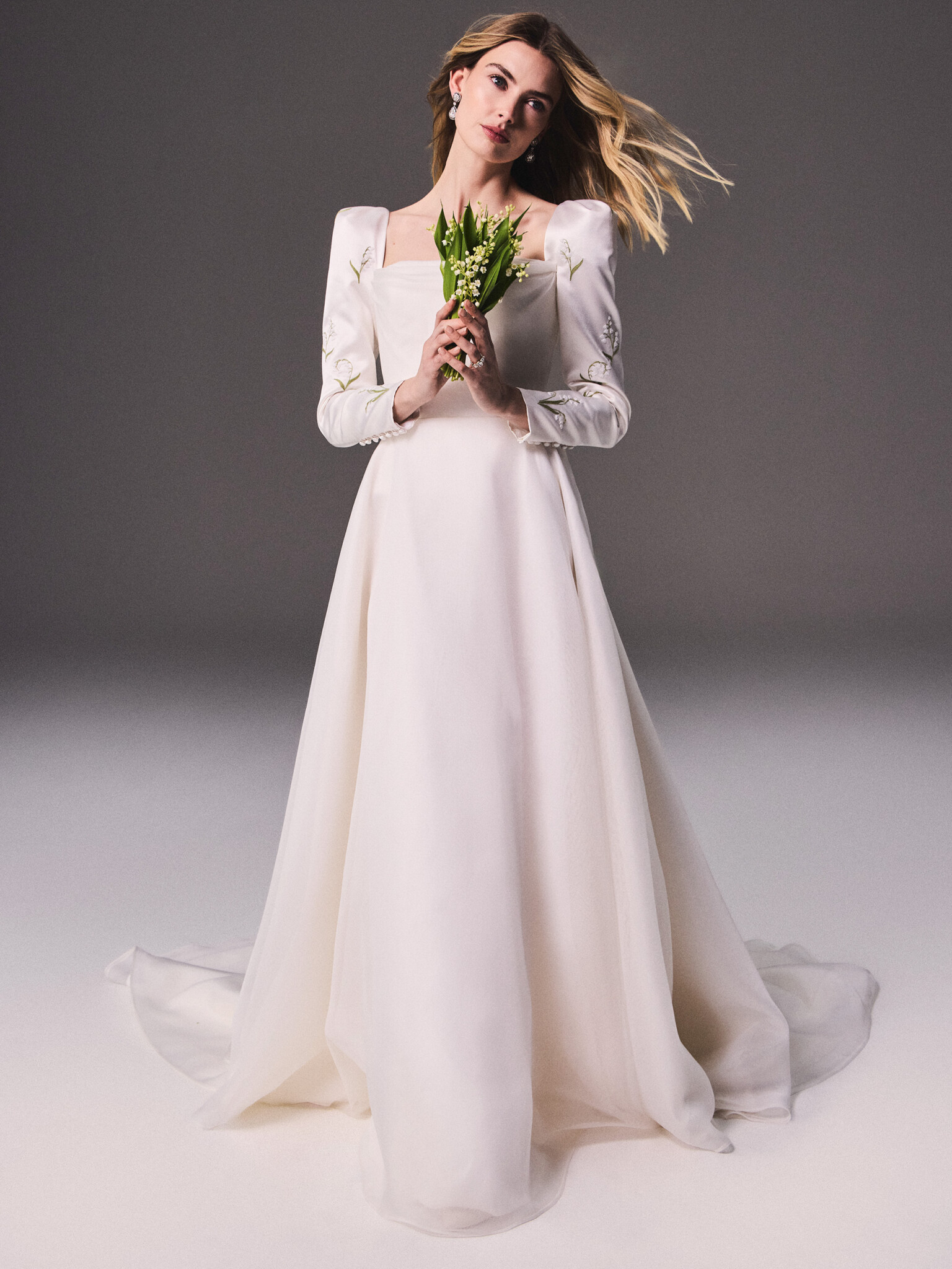 In this collection, embroidery techniques reach new heights. Satin, stem, chain and bullion stitches are combined to depict flowers, leaves and petals in an exquisitely realistic way. A wreath of roses along the border of a watteau train is cleverly reflected in a hidden pattern on the Vienna Opera Sleeve, while Rivoli Fleur Whisper’s wildflowers are embroidered at a third of their usual scale to create a doll-like delicacy. One design, including 14 lily of the valley motifs, showcases the mastery of Phillipa Lepley artisans within the complex bell petal shapes, as does hand-embroidered corded lace, a couture technique which elevates details even more elegantly. The Lucky In love top is playfully hand-embroidered with sentimental, hidden four-leaf clovers for brides to discover.