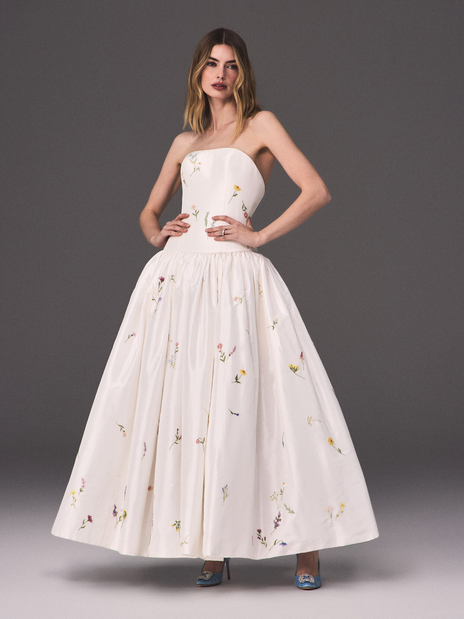 The Bramling coat is a remarkable couture creation and a centerpiece of Chapter Forty, crafted from a new silk brocade exclusively woven for Phillipa Lepley in the UK, supporting the finest British heritage artisans. Silk faille in soft pink is another new fabric used in this collection and Phillipa has combined two fabrics for the first time, to striking effect; the Mesange Epure design has a silk zibeline bodice and satin skirt. Sheer satin organza and crisp white taffeta are given a chic modern look courtesy of new hand-embroidery and the use of French knots creates a very understated, matte look.
