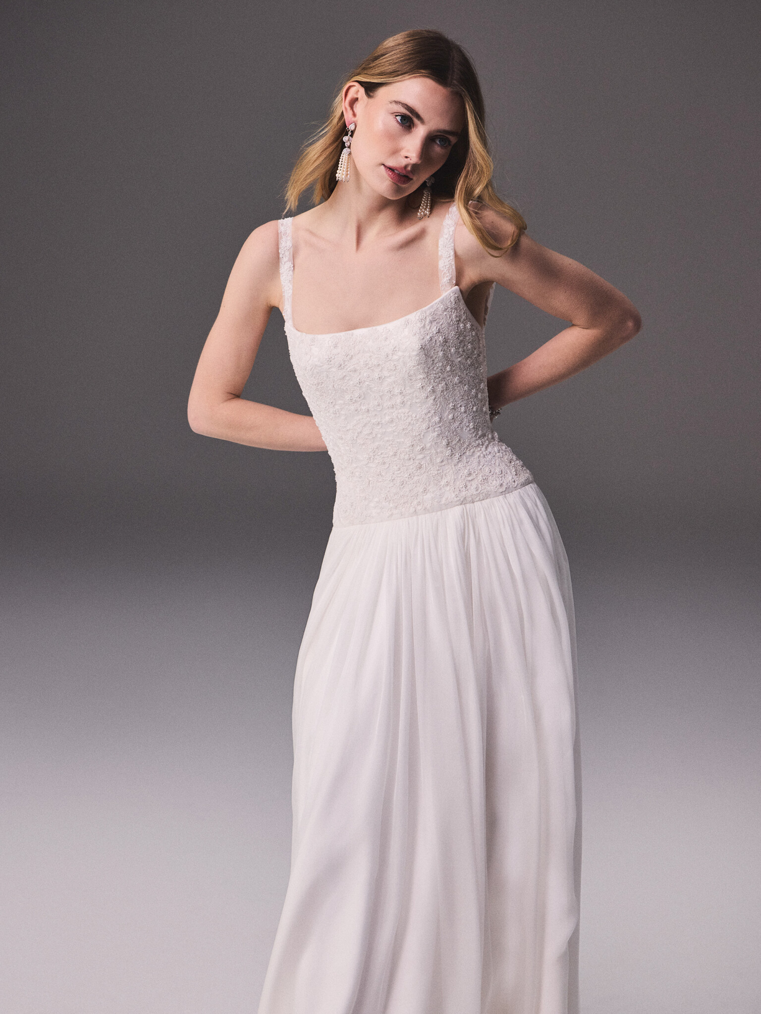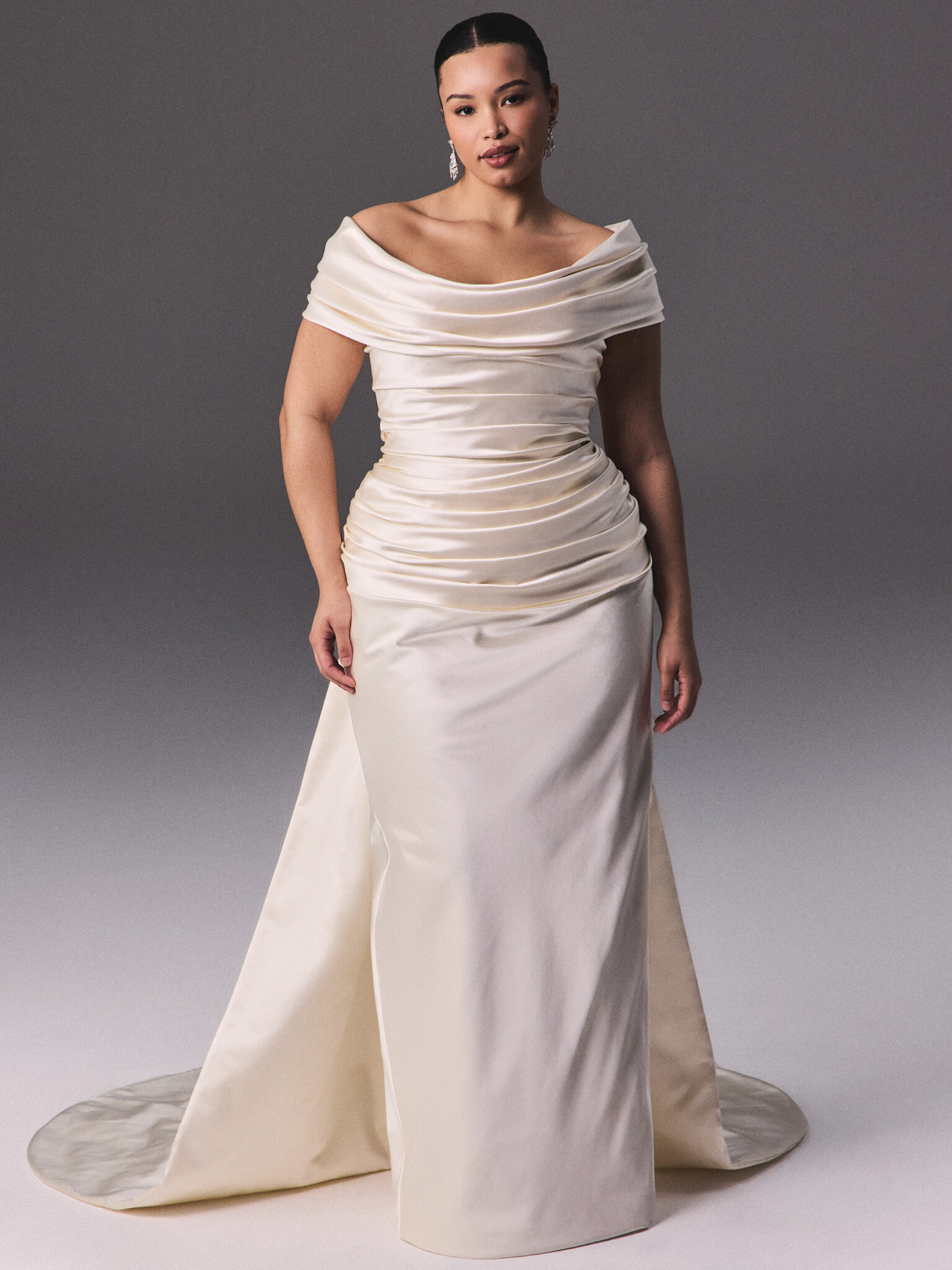 Phillipa’s commitment to celebrating the female form in all its manifestations shines through in Chapter Forty. Every seam, drape and line has been intentionally designed; figure-hugging column dresses are cleverly cut using jodhpur seams, panels and pleats. Mid-length, straight and dropped waist dresses all celebrate the beauty of curves, as do square necklaces and modern off-the-shoulder designs. Tea-length dresses feature more than ever before, giving brides a versatile contemporary option for civil ceremonies or dancing, especially when paired with shorter veils.