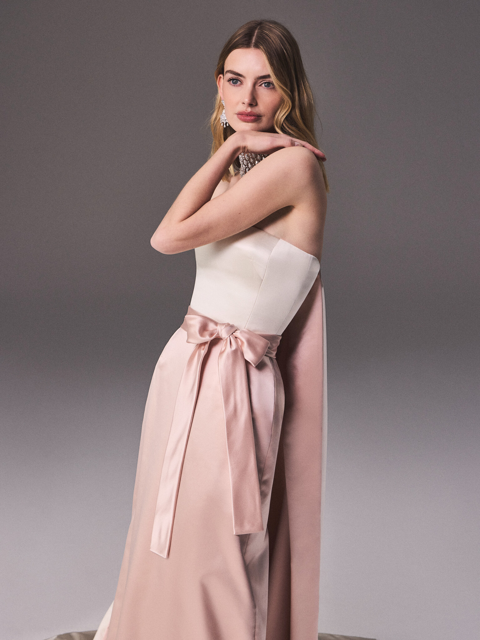 Phillipa’s most adored design elements, from duchess satin and bows to meadow motifs, all feature in Chapter Forty, as do a number of removable watteaux, a style statement that introduces great versatility; brides can change their look and add drama as their day unfolds. Phillipa has continued to focus on styling tools for her brides, from removable sleeves and tops to fabulous trains and coats, ensuring elements can be combined or removed to create more than one couture wedding look. Soft colour makes a beautiful entrance by way of dusty pink tones and café-au-lait silk crepe; one exquisite two-tone dress is pale pink and ivory from the front, but from behind appears entirely ivory.