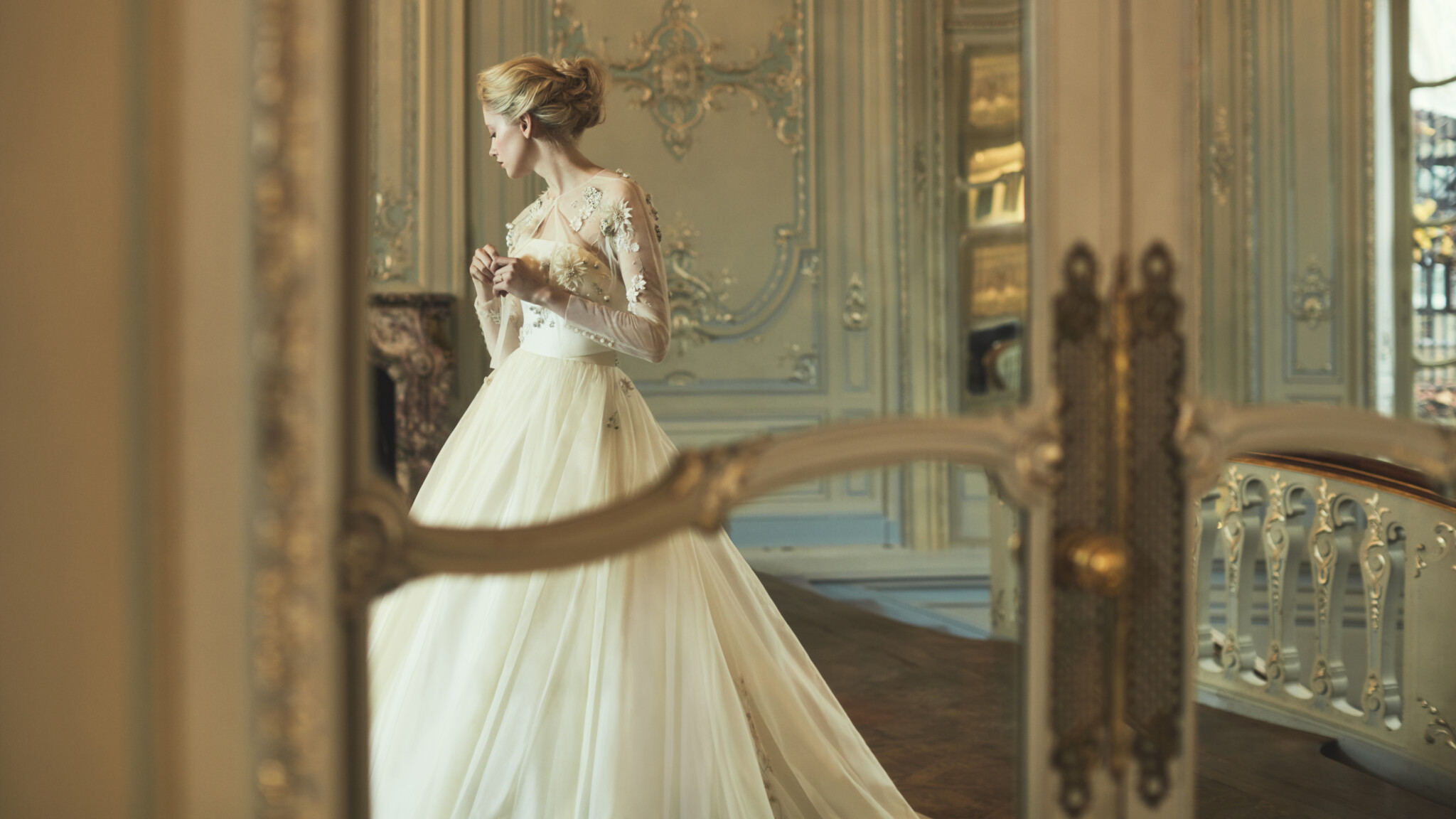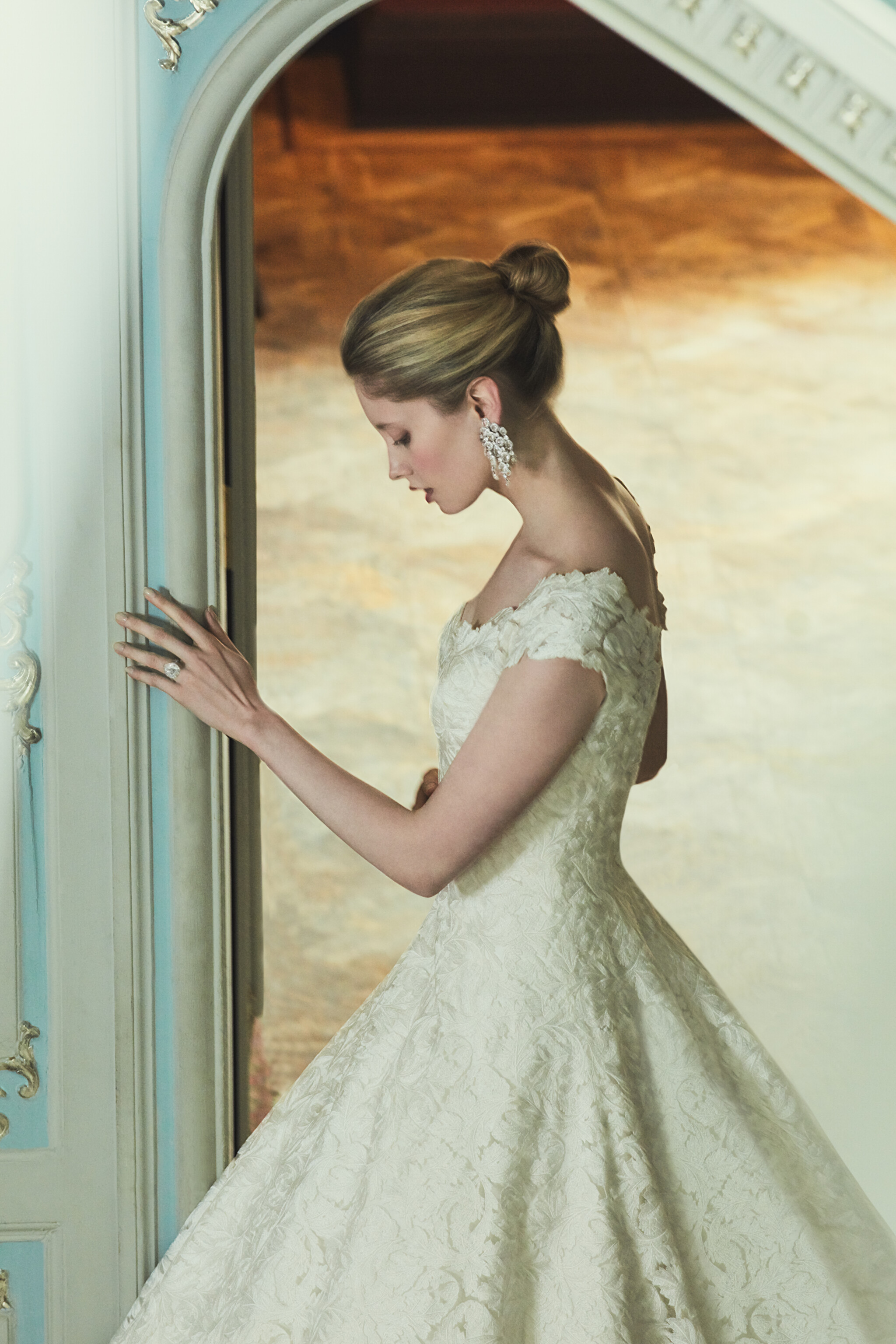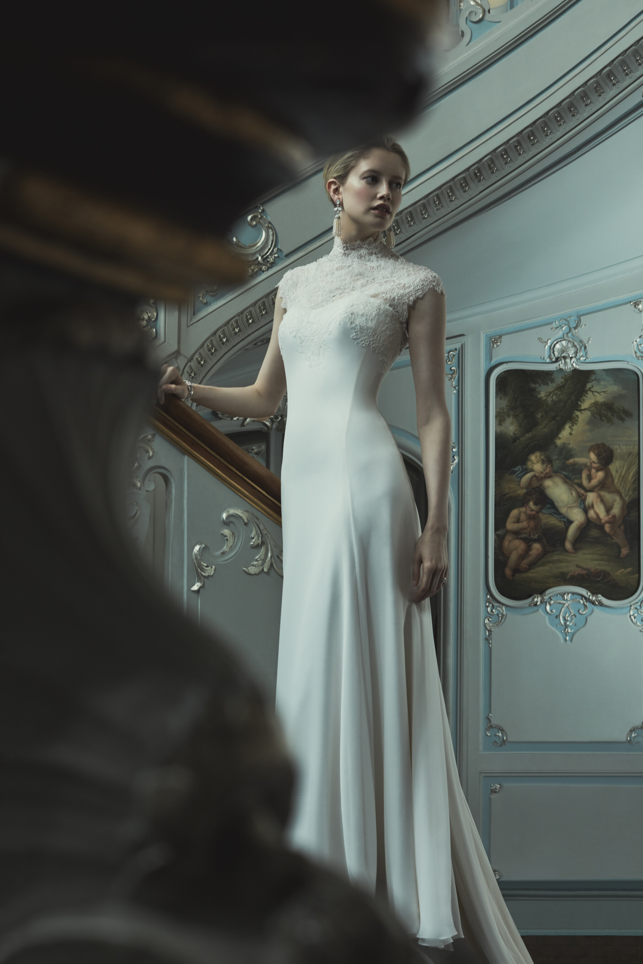 High necklines, full skirts and cathedral-length silk tulle veils add a sense of drama and romance, bringing a modern fairytale quality to the collection.