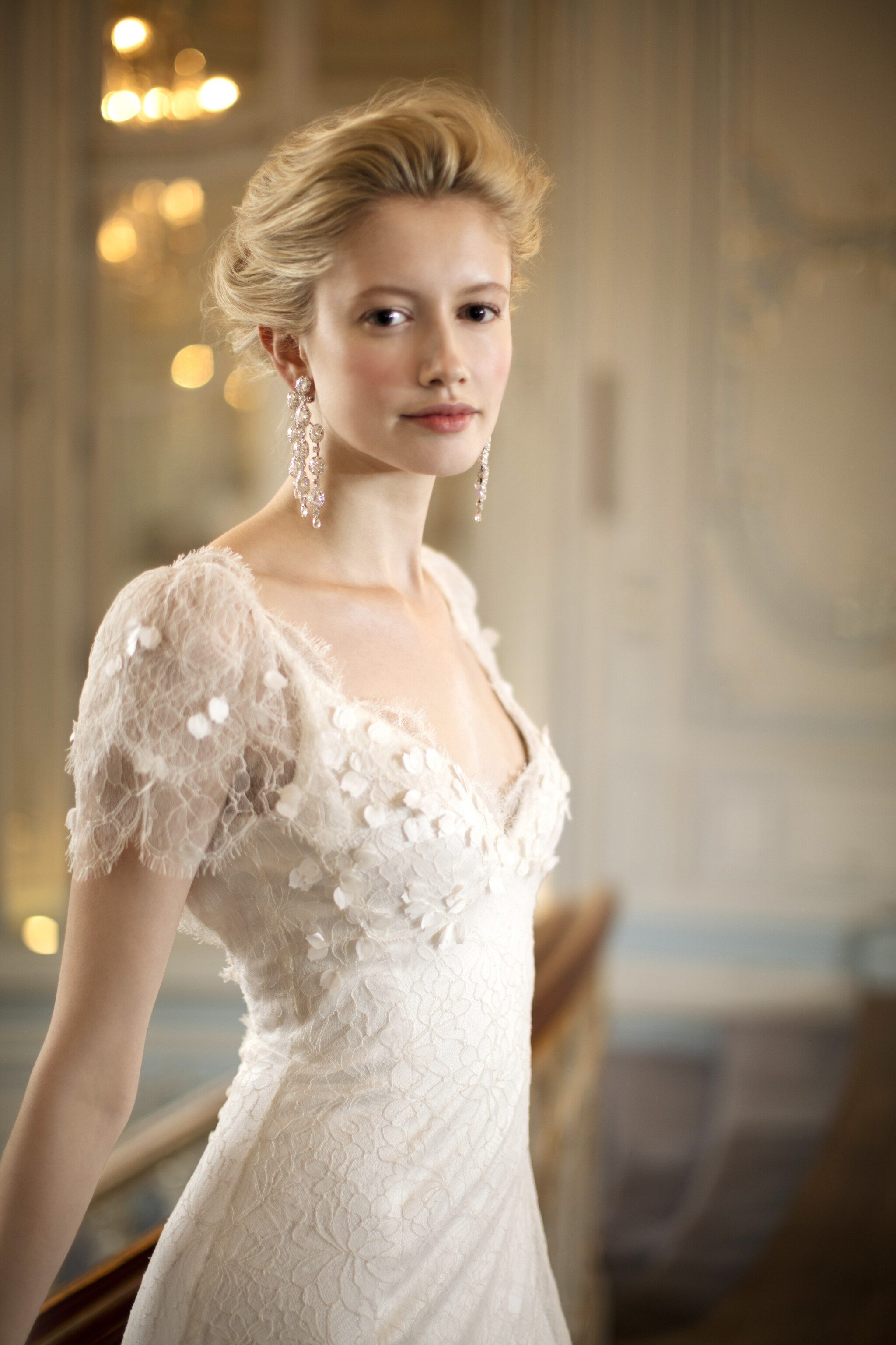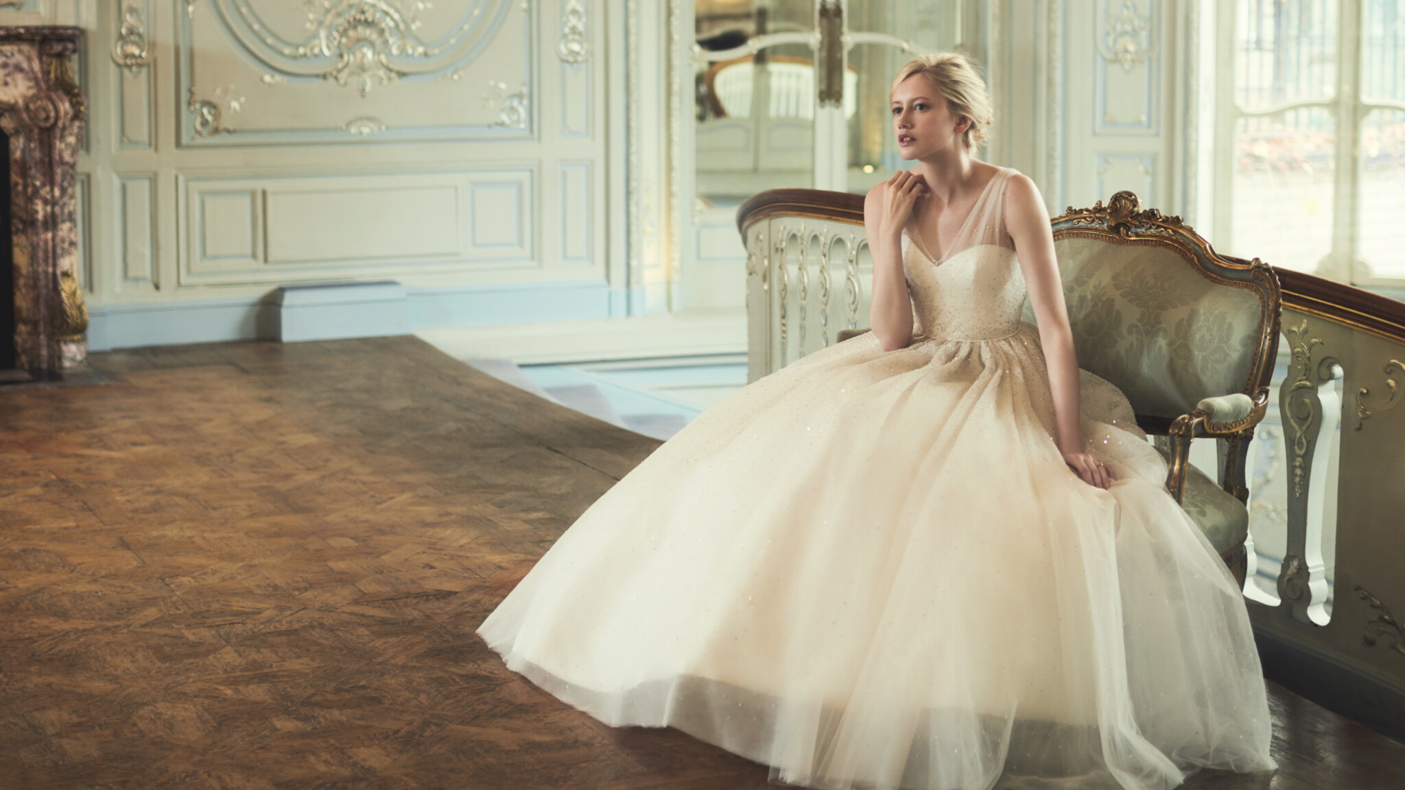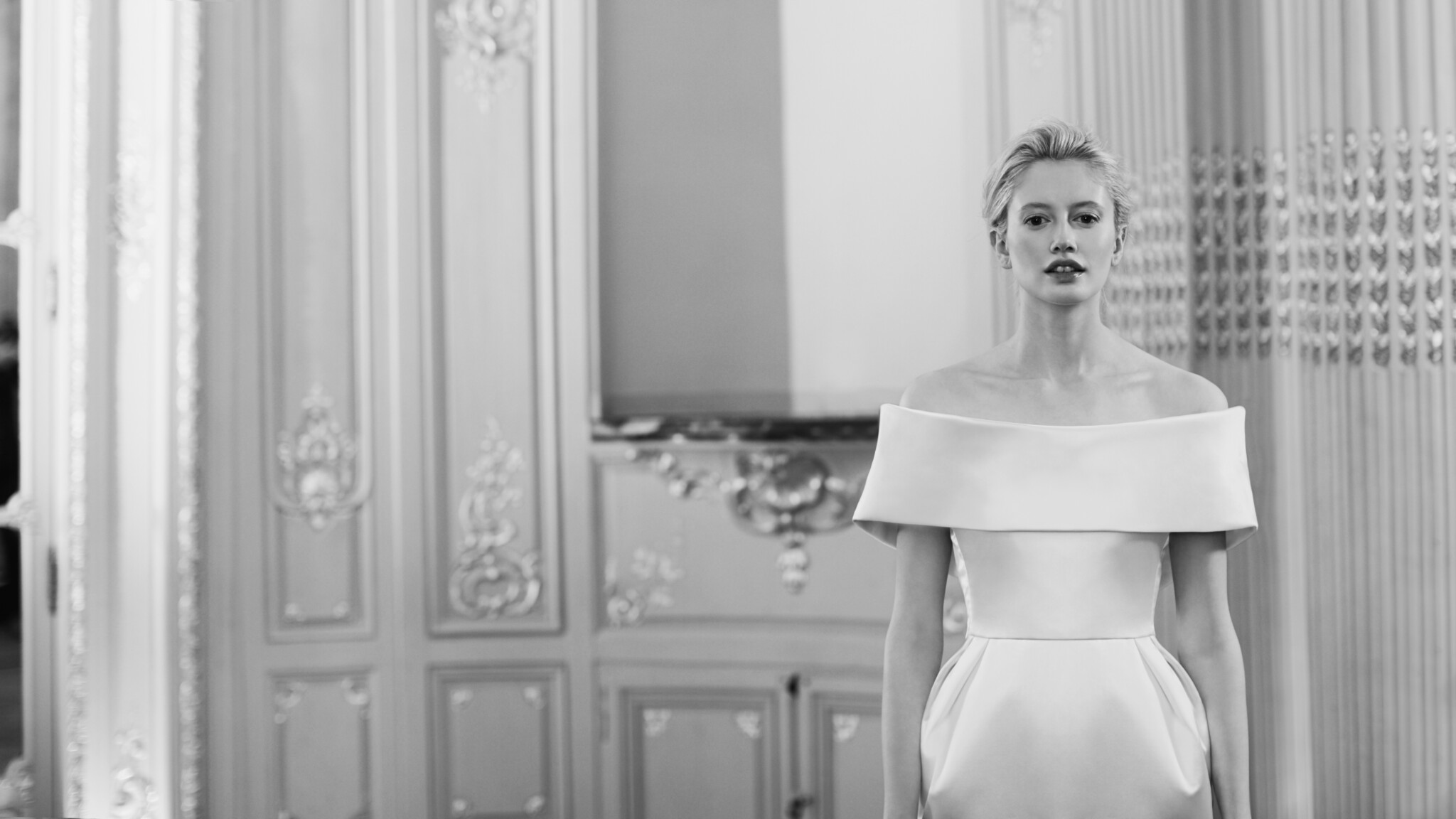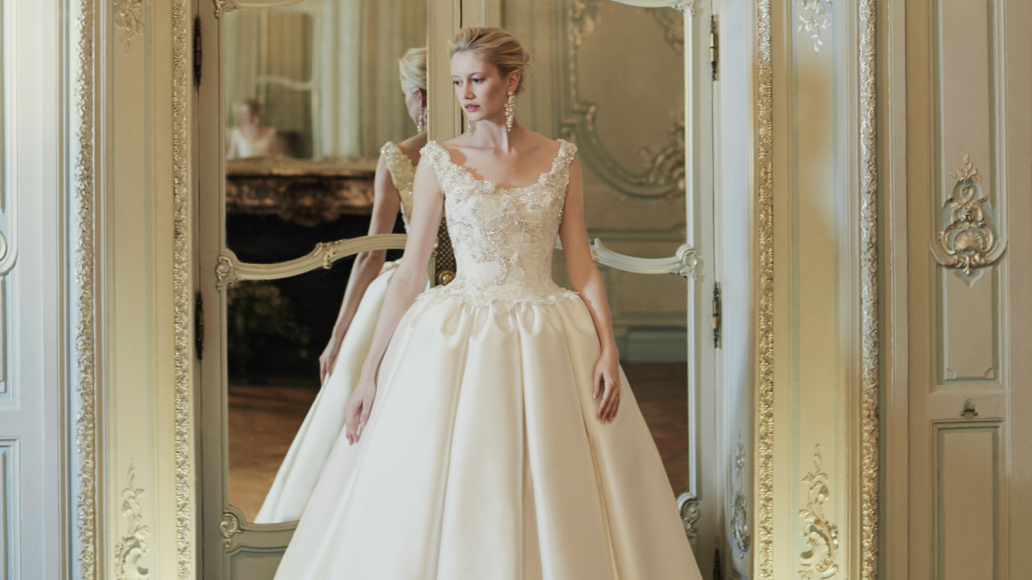 High necklines, full skirts and cathedral-length silk tulle veils add a sense of drama and romance, bringing a modern fairytale quality to the collection.