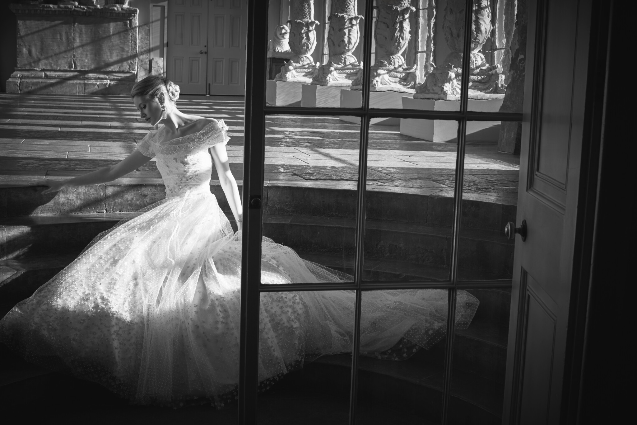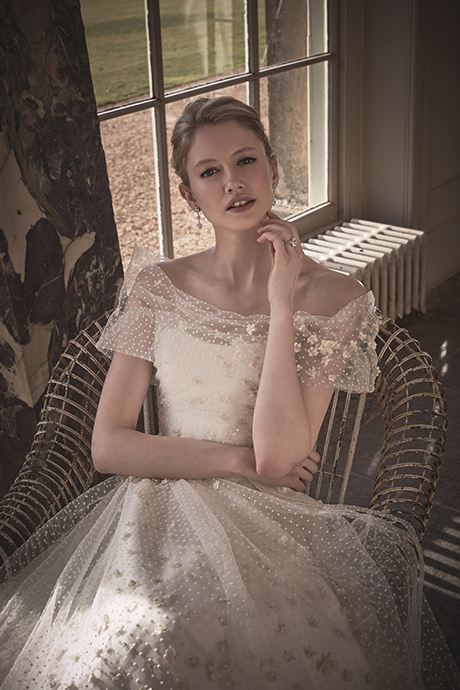 While the silhouettes remain clean, Restoration is rich in detail. Intricate embroidered overlays are layered with care – from delicate polka dots to whimsical 3D florals and even ostrich feathers – bringing texture, light movement and graceful femininity to each design. Phillipa’s innovative use of fine French laces elevates the collection further, with layers of Chantilly lace meticulously placed in a playful, tiered effect and secured with thousands of tiny, precise stitches.