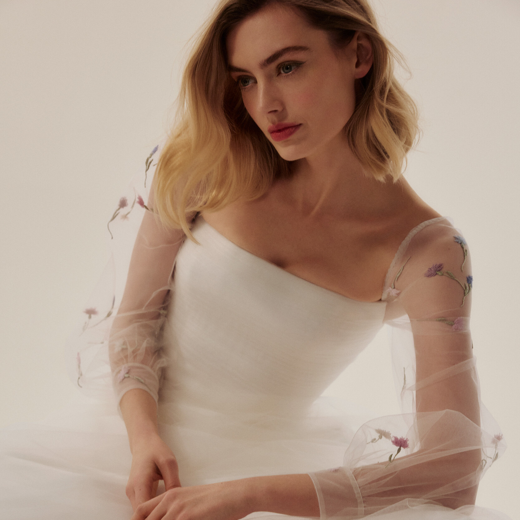 Vienna Tulle Cornflower Featuring hand-embroidered cornflowers, meticulously arranged on a diaphanous tulle puffed sleeves, this ethereal wedding dress creates the illusion of florals floating weightlessly in space. Discover