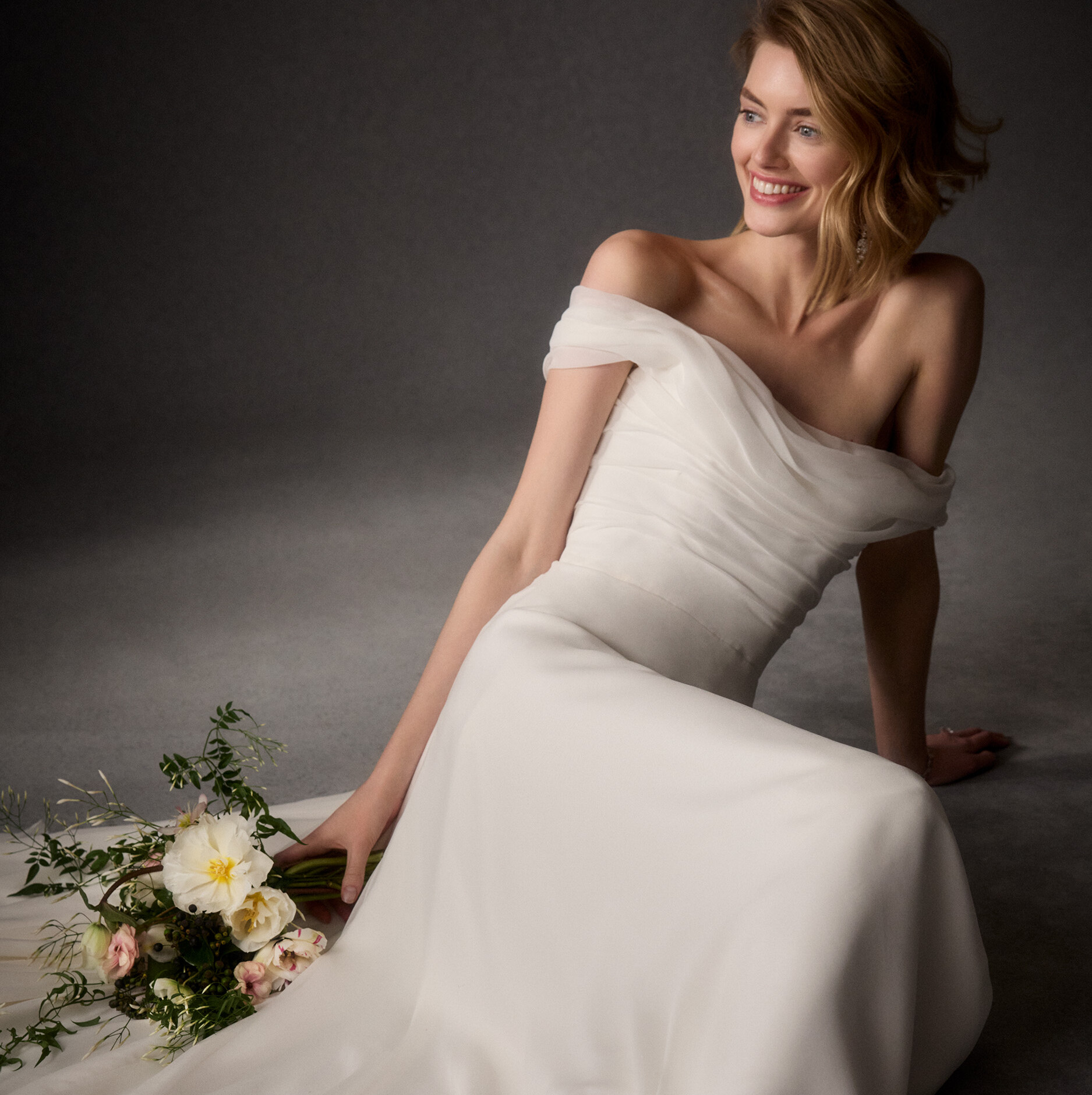 Élégance A minimalist beauty, ‘Élégance’ is a lightweight, off-the-shoulder gown crafted from luxurious georgette. Discover